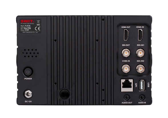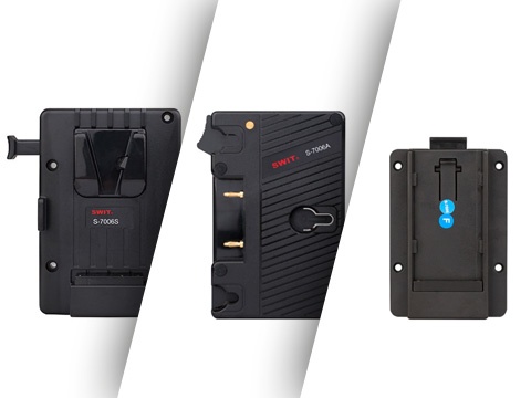 S-1073F supports DC 6.5-36V input via a 5.5mm lockable DC socket, and can install SWIT S-7006 series V-mount / Gold mount / DV battery plates to power: